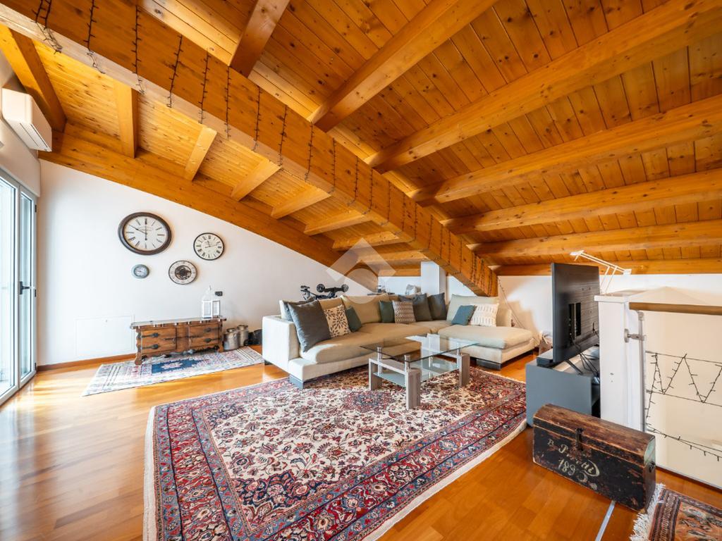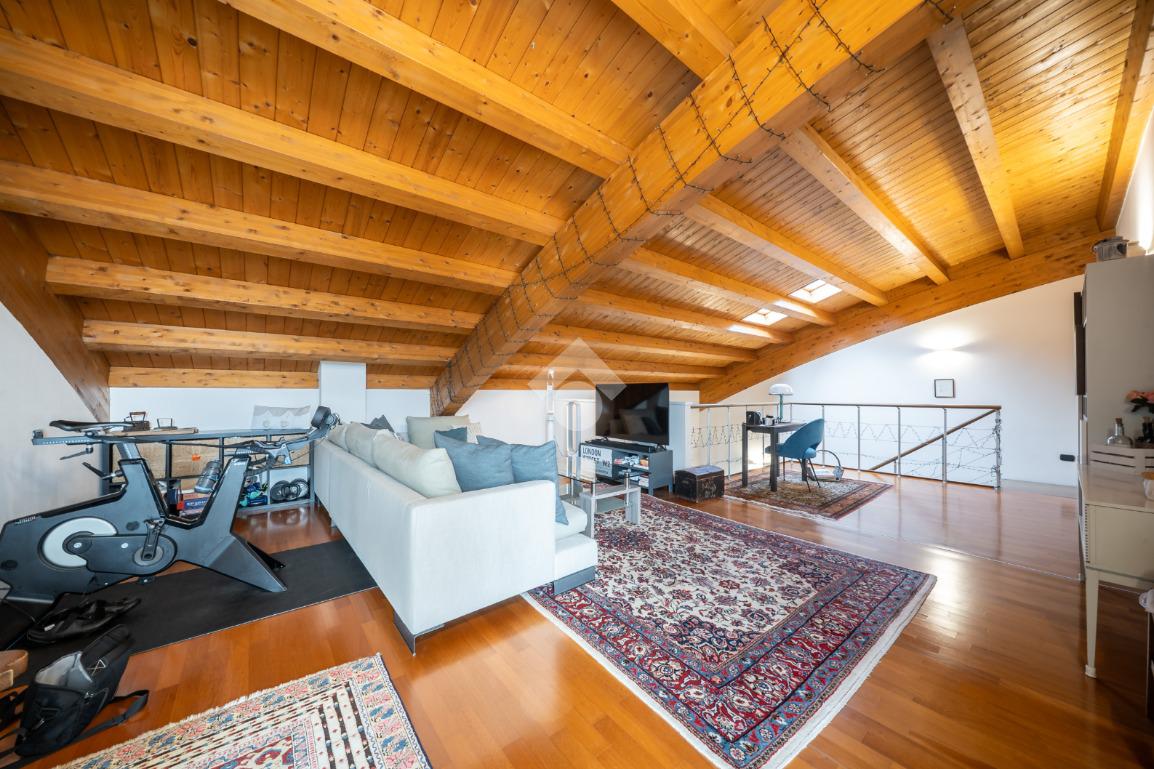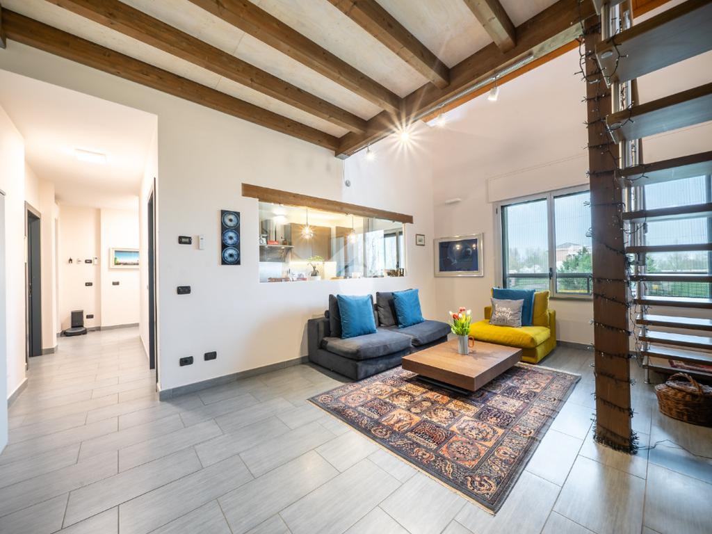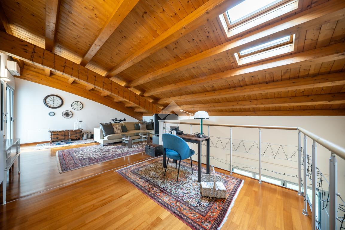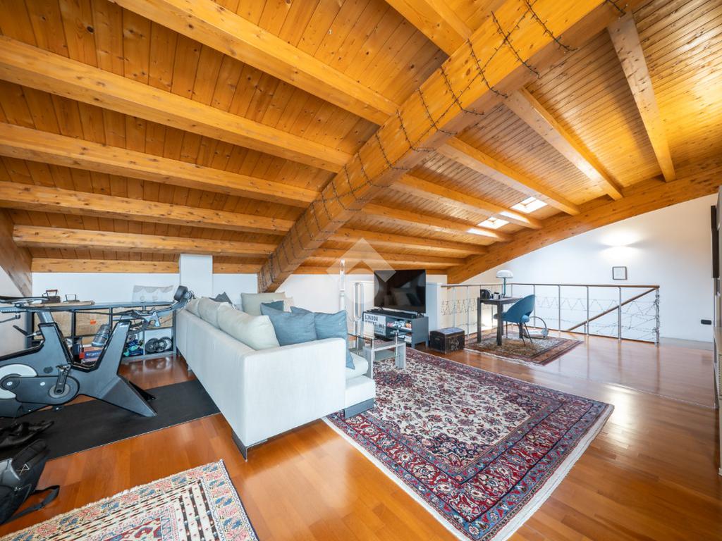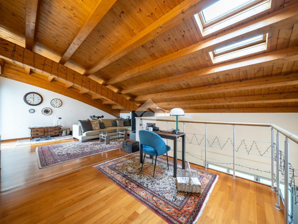 Salendo al piano superiore troviamo un ambiente open space con travi a vista e soppalco con vista sul soggiorno, un terzo bagno con doccia e l’elemento più esclusivo della proprietà: uno straordinario terrazzo panoramico di circa 100 mq, uno spazio raro e riservato, ideale per momenti di relax o convivialità all’aperto.