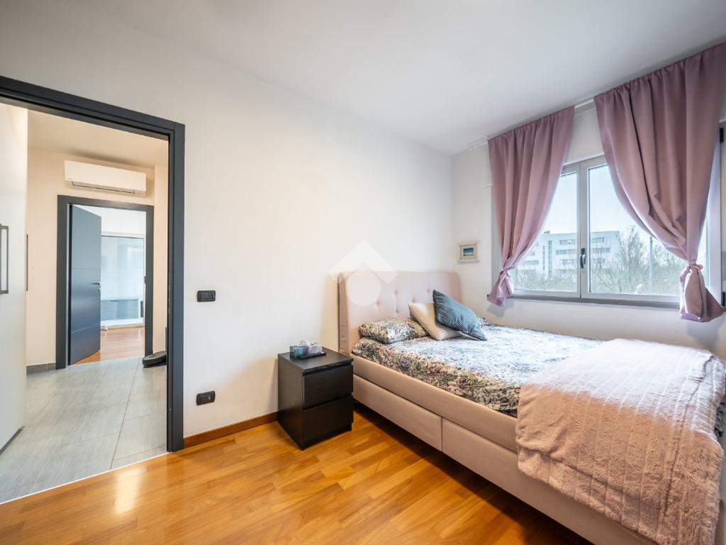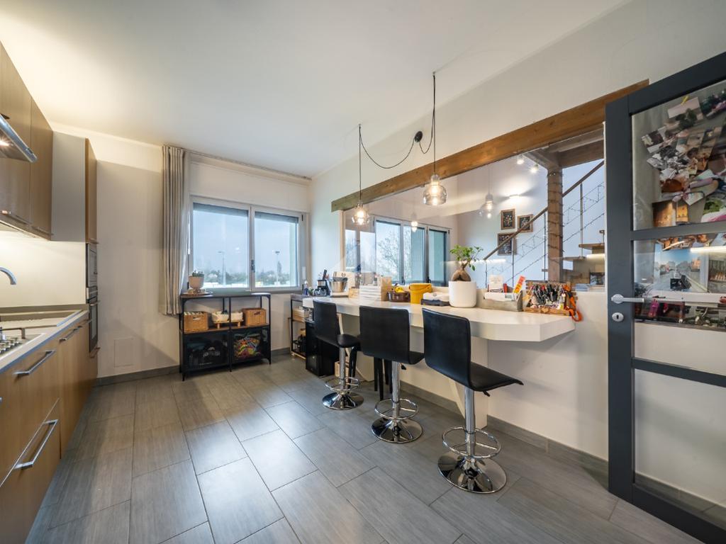 L’ingresso si apre su un luminoso soggiorno, affiancato da una cucina abitabile valorizzata da un’elegante vetrata che crea continuità visiva con la zona giorno. Il mobilio della cucina è incluso nel prezzo, offrendo una soluzione pronta da vivere. La zona notte ospita due ampie camere matrimoniali, di cui una con loggia coperta privata, e due bagni.